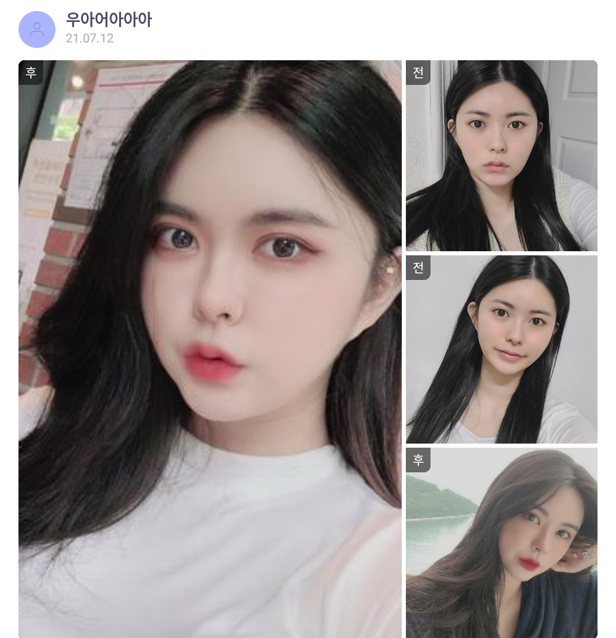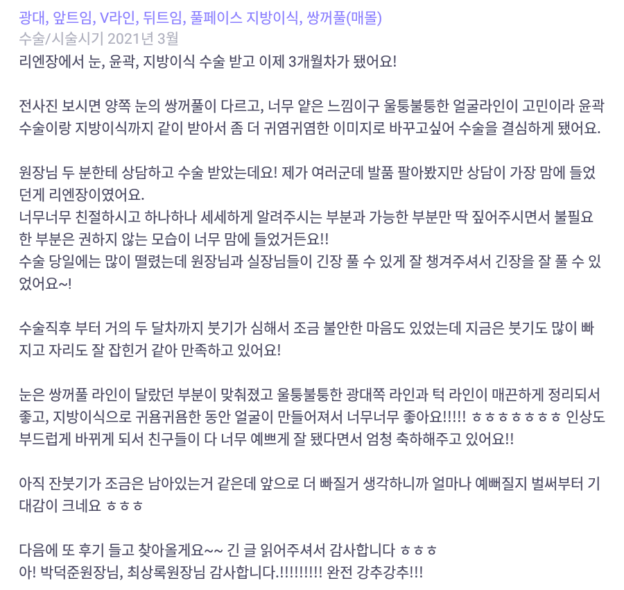 Viện Phẫu thuật Thẩm mỹ Lienjang ★★★★★ 5.0 [바비톡] 지방이식, 안면윤곽, 쌍꺼풀 / 3개월차/ 닉네임:우아어아아아 Ẩ******@ | 2022.01.11 | 18 리엔장성형외과에서 수술 받은 후 강남언니에 업로드한 실제 후기입니다. 수술항목: 윤곽 3종, 쌍꺼풀(매몰), 풀페이스 지방이식 Quay lại danh sách