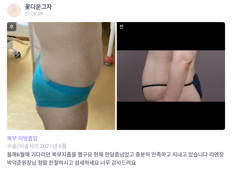 Viện Phẫu thuật Thẩm mỹ Lienjang ★★★★★ 5.0 [바비톡] 지방흡입 / 1개월차/ 닉네임:꽃다운그자 Ẩ******@ | 2022.01.11 | 21 Quay lại danh sách