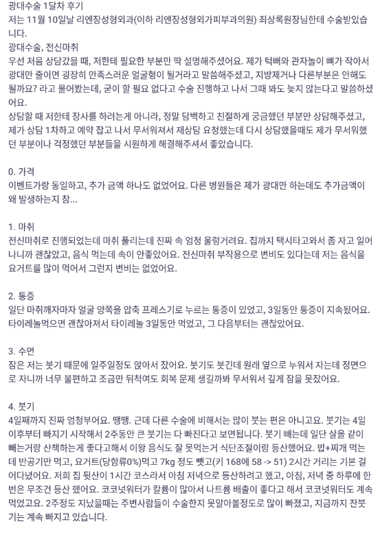 Viện Phẫu thuật Thẩm mỹ Lienjang ★★★★★ 5.0 [바비톡] 안면윤곽 / 1개월차/ 닉네임: 다라뮈 Ẩ******@ | 2022.01.18 | 19 리엔장성형외과에서 수술 받은 후 바비톡에 업로드한 실제 후기입니다. 수술항목: 광대축소 Quay lại danh sách
