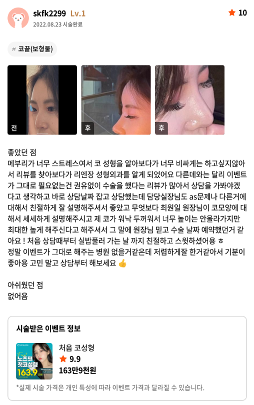 Viện Phẫu thuật Thẩm mỹ Lienjang ★★★★★ 5.0 [강남언니] 코성형 / 1개월차 / 닉네임:skfk2299 Ẩ******@ | 2022.09.28 | 16 Quay lại danh sách