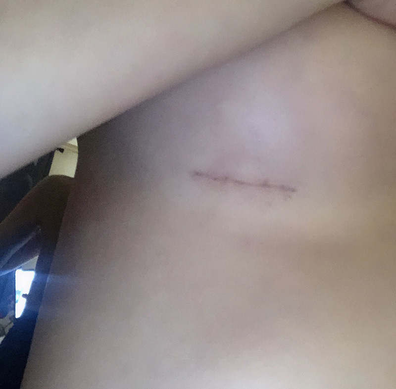 Vì vết thương không được khâu mà được dán bằng keo, nên mình cảm thấy nó lành rất nhanh!? Bây giờ keo đã bong hết và chỉ còn vảy, nhưng vì sợ để lại sẹo nên mình đang bôi thuốc trị sẹo từ hôm nay.