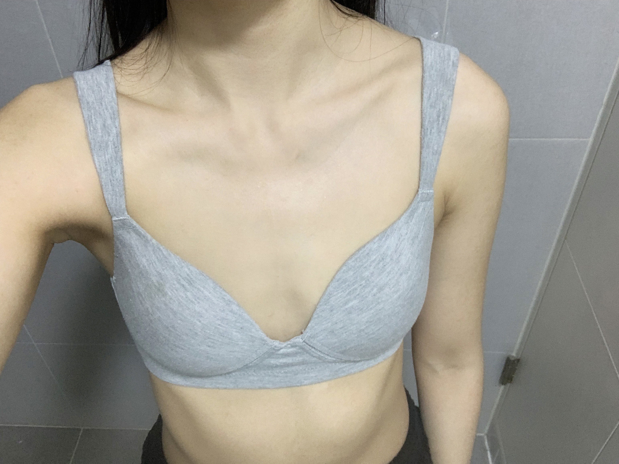 Vì là ngày hôm sau phẫu thuật nên mình đang mặc áo ngực thể thao Nana, chưa thể nhìn rõ dáng ngực, nhưng có thể thấy rõ độ đầy đặn tự nhiên mà mình mong muốn.