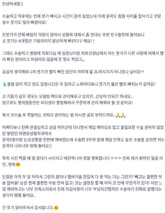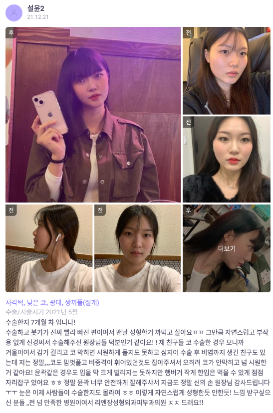 Viện Phẫu thuật Thẩm mỹ Lienjang ★★★★★ 5.0 [바비톡] 안면윤곽, 쌍꺼풀, 코성형 / 7개월차 / 닉네임 : 설윤2 Ẩ******@ | 2022.01.18 | 26 리엔장성형외과에서 수술 받은 후 바비톡에 업로드한 실제 후기입니다.수술항목: 광대축소, 사각턱축소, 턱끝성형, 쌍꺼풀(절개), 코성형 Quay lại danh sách