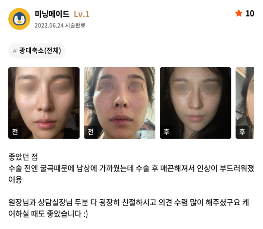 Viện Phẫu thuật Thẩm mỹ Lienjang ★★★★★ 5.0 [강남언니] 광대 / 1개월차 / 닉네임:미닝메이드 Ẩ******@ | 2022.07.08 | 25 Quay lại danh sách