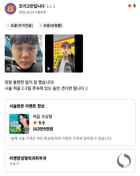 Viện Phẫu thuật Thẩm mỹ Lienjang ★★★★★ 5.0 [강남언니] 코성형 / 2개월차/ 닉네임:코가고민입니다 Ẩ******@ | 2022.10.24 | 29 Quay lại danh sách