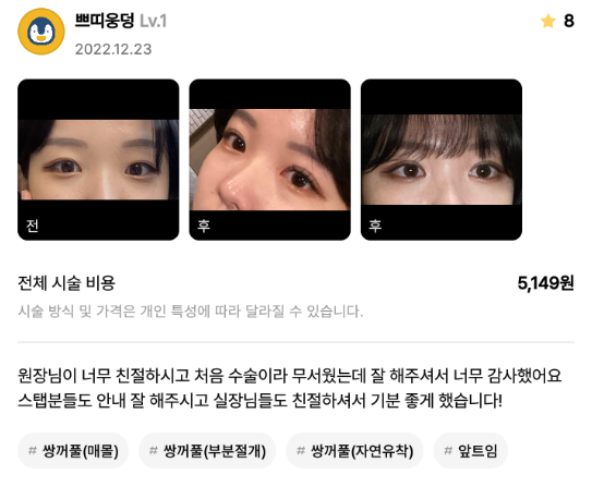 Viện Phẫu thuật Thẩm mỹ Lienjang ★★★★★ 5.0 [강남언니] 쌍꺼풀 1개월차 /닉네임 : 쁘띠웅덩 Ẩ******@ | 2023.02.13 | 25 Quay lại danh sách