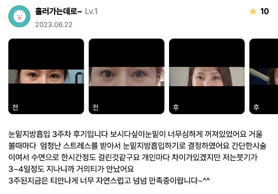Viện Phẫu thuật Thẩm mỹ Lienjang ★★★★★ 5.0 [강남언니] 눈밑지방이식 / 3주차 / 닉네임 : 흘러가는데로~ Ẩ******@ | 2023.06.22 | 23 Quay lại danh sách